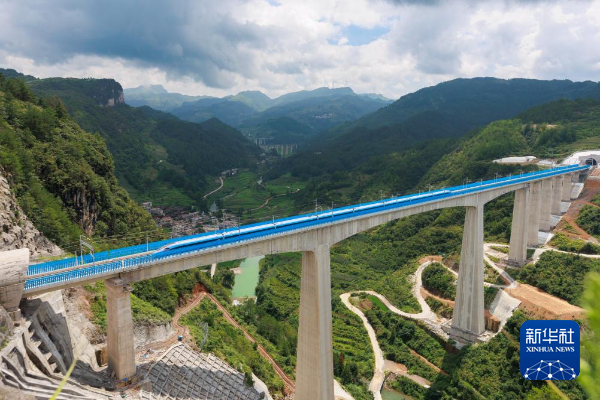试验动车组经过位于贵州省贵定县的贵南高铁桐子园特大桥(2023年8月4日摄)。
