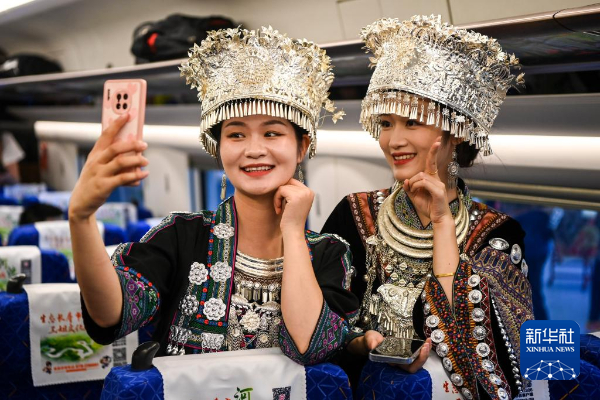 8月31日,在由南宁东开往贵阳北的G4308次列车上,身穿少数民族服装的乘客在合影留念。