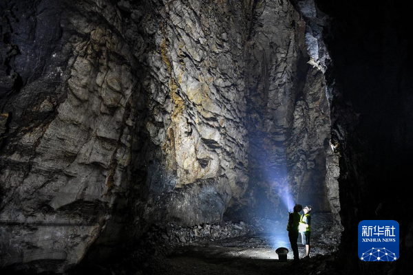 2022年8月3日,在位于广西环江毛南族自治县的贵南高铁大方山隧道内,技术人员在查看施工中发现的溶洞。
