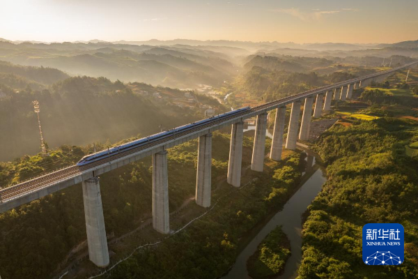 2023年 8月31日,一列动车组在晨曦中经过位于贵州省独山县郊外的贵南高铁银坡河特大桥(无人机照片)。