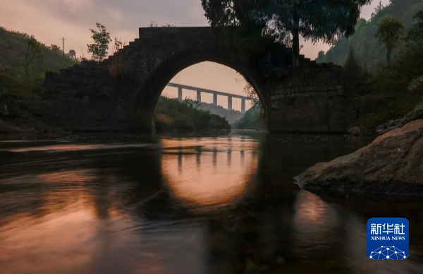 如果桐子园特大桥是现代科技的新生儿,那位于贵州省独山县的蒙家桥就是历经沧桑的老者。这位建于清代光绪年间的“老者”距今已经140多年历史。百年来它一直孤单地连通着银坡河两岸,时至今日仍然有当地百姓从它身上走过。孤独的守护直到贵南高铁银坡河特大桥的建设。记者前后共七八次来到银坡河边,既是因为报道银坡河特大桥的各种建设节点,亦是被蒙家桥的古朴所吸引。两座年纪相差140多年的“忘年交”就那样静静矗立在银坡河边,他们有着共同的任务——让山里的人们更方便地走出大山。星空下、夕阳里,记者为这两位“忘年交”拍下了不少照片,青石与钢铁、古老与现代在这里交相辉映、熠熠生辉。