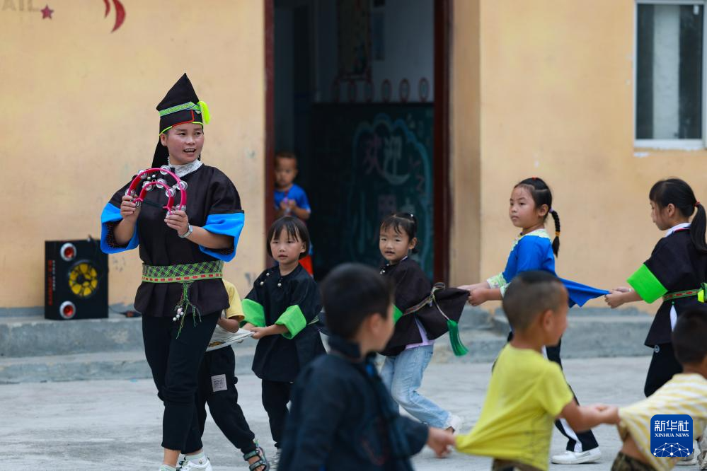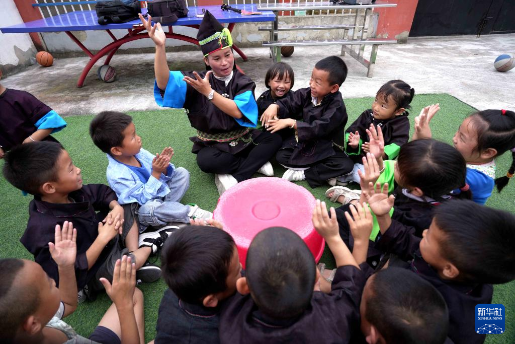 柳吉小学教师王章艳带领学生在课间玩游戏(9月7日摄)。新华社记者 刘续 摄pagebreak