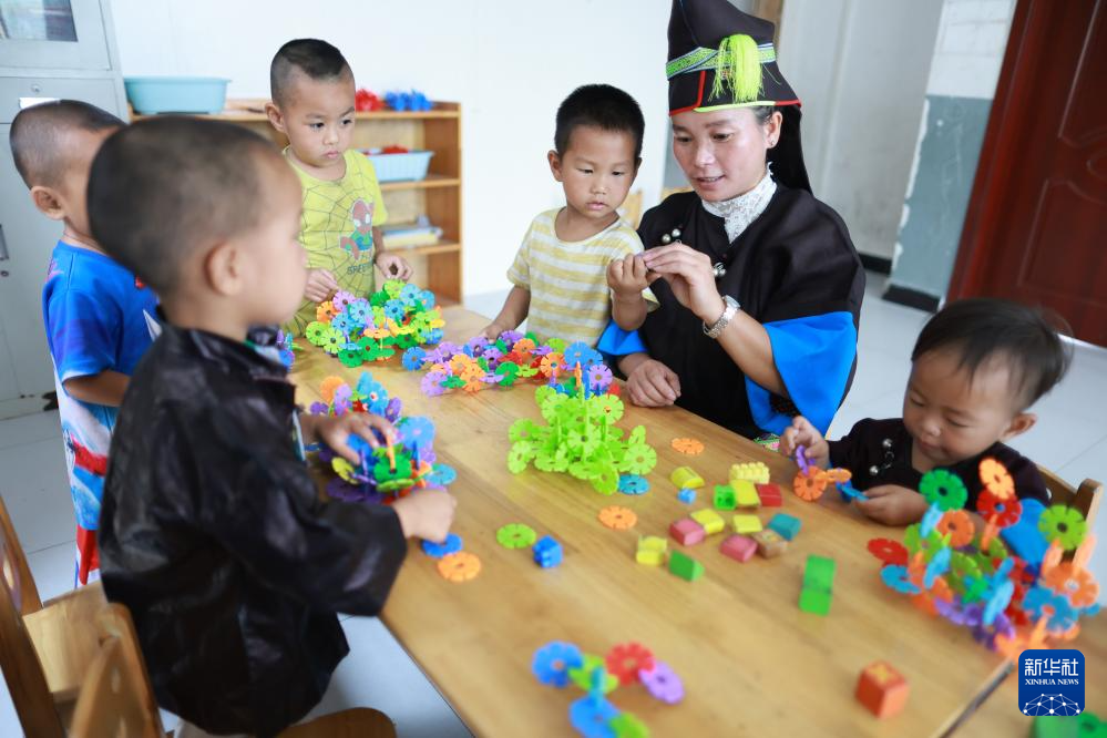 柳吉小学教师王章艳陪学生一起玩玩具(9月7日摄)。