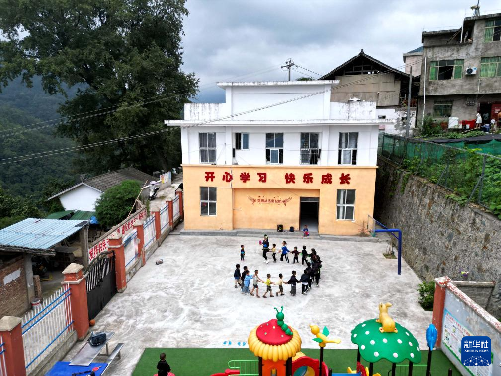 柳吉小学教师王章艳带领学生在课间玩游戏(9月7日摄,无人机照片)。新华社发(王炳真 摄)pagebreak