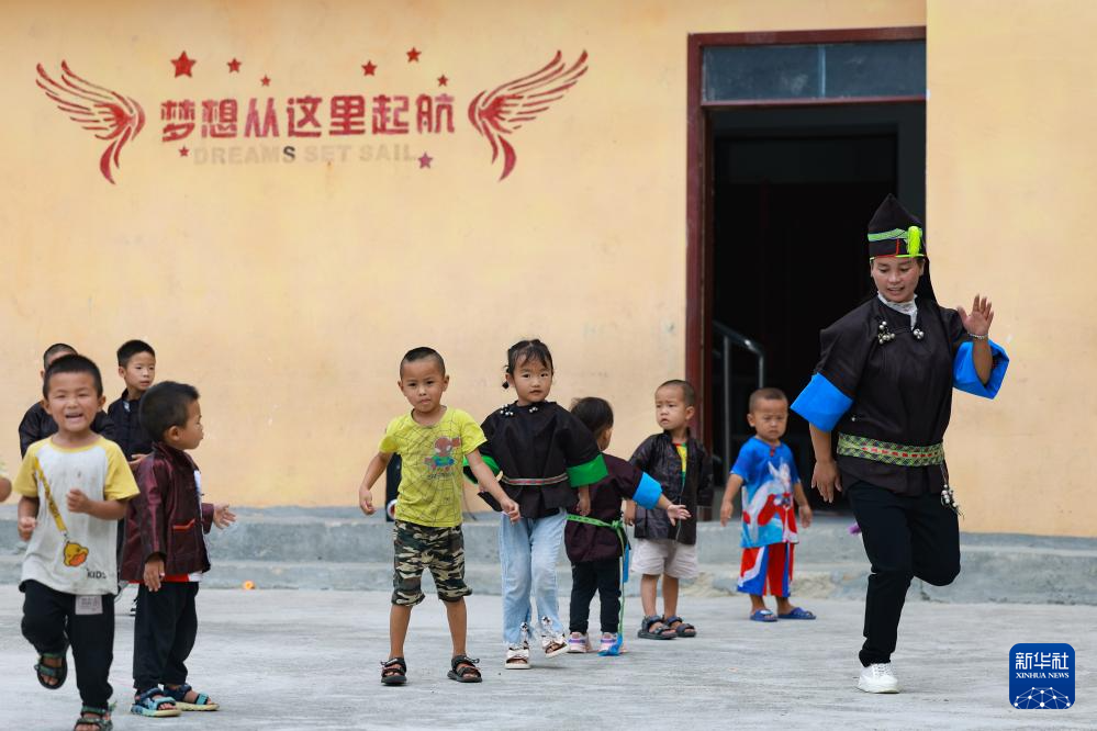 柳吉小学教师王章艳带领学生在课间玩游戏(9月7日摄)。新华社发(王炳真 摄)pagebreak