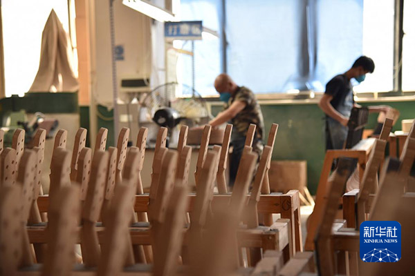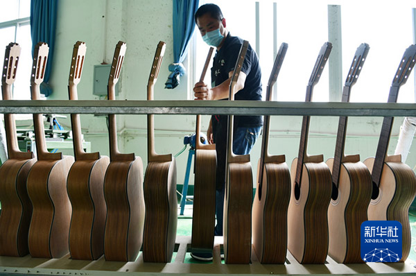 2020年3月25日,在贵州省正安县的吉他文化产业园,工人把吉他半成品放到架子上。新华社记者 杨文斌 摄