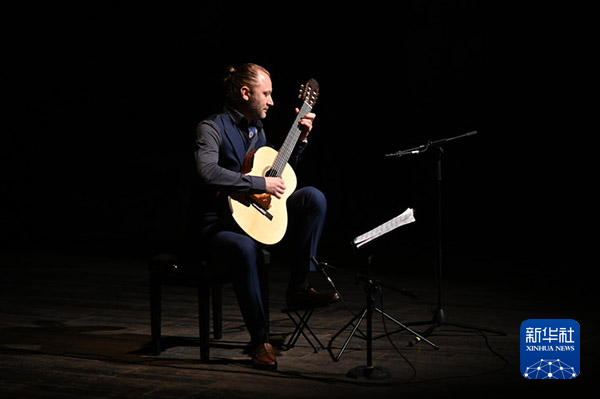 2021年4月2日,俄罗斯吉他演奏家格里戈里·诺维科夫在俄罗斯彼尔姆市一场音乐会上弹奏吉他。新华社发(受访者供图)