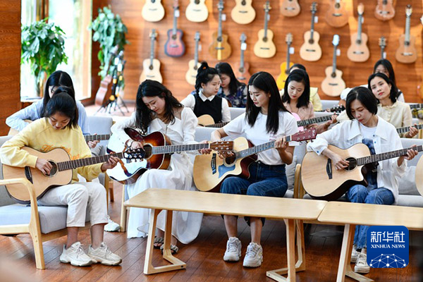 2022年5月13日,在贵州省正安县娜塔莎公司吉他文化展厅,当地机关女职工在学习弹奏吉他。新华社记者 杨文斌 摄