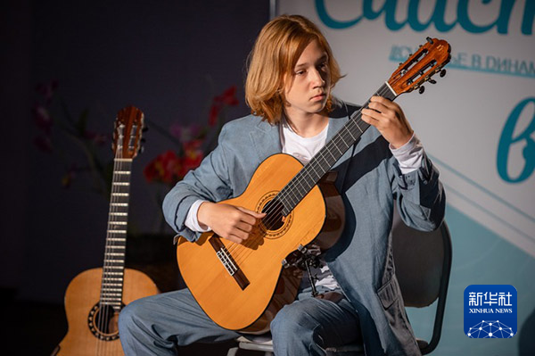 2022年8月23日,俄罗斯吉他演奏家格里戈里·诺维科夫的学生叶戈尔在彼尔姆市的音乐学校用娜塔莎公司制造的吉他弹奏。新华社发(受访者供图)