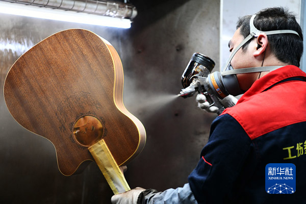 2020年3月25日,在贵州省正安县的吉他文化产业园,工人在生产车间给吉他喷漆。新华社记者 杨文斌 摄