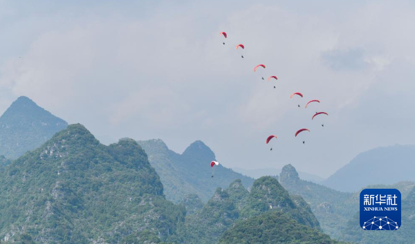 9月16日,运动员在2023国际山地旅游暨户外运动大会开幕式上进行滑翔伞表演。新华社记者 杨文斌 摄