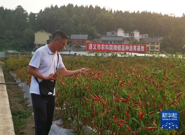 遵义市农业科学院辣椒研究所所长田浩正在选育基地里查看辣椒长势。新华社记者 杨欣摄