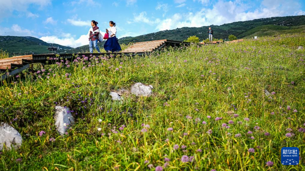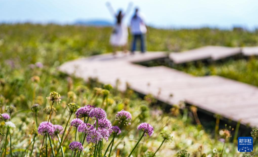 近日,贵州省六盘水市钟山区大湾镇韭菜坪景区内的韭菜花竞相绽放,吸引不少游客前来观光游玩。