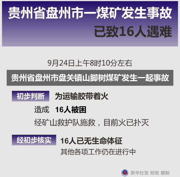 新华社贵阳9月24日电(记者潘德鑫)记者从贵州省盘州市人民政府获悉,24日上午8时10分左右,盘州市盘关镇山脚树煤矿发生一起事故,初步判断为运输胶带着火,造成16人被困。经矿山救护队施救,目前火已扑灭,出事工作面温度和气体恢复正常。经初步核实,16人已无生命体征,其他各项工作仍在进行中。