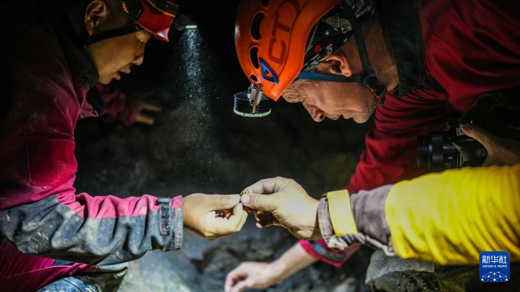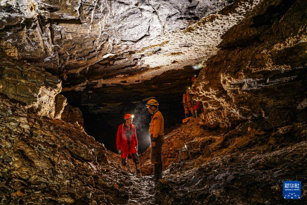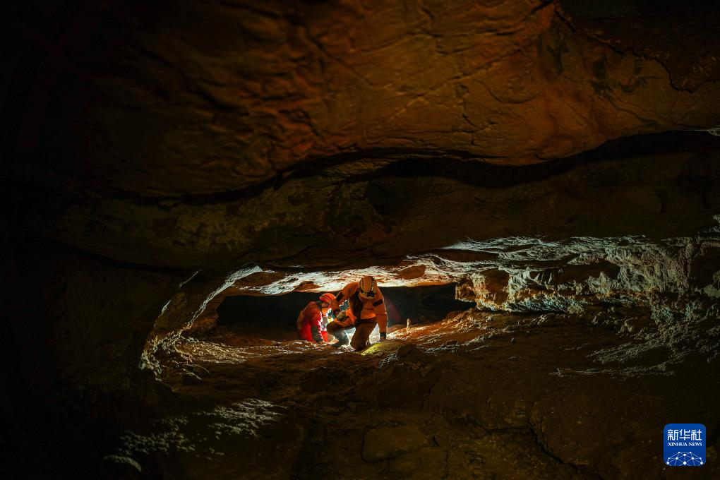 意大利专家和贵州省山地资源研究所科考队员在双河洞一处支洞中进行科考(9月22日摄)。新华社发(赵飞 摄)
