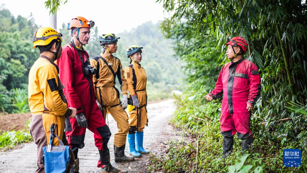 意大利专家(左二)和贵州省山地资源研究所科考队员整队完毕准备开始探洞(9月24日摄)。新华社记者 陶亮 摄
