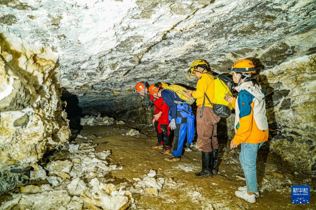 贵州省山地资源研究所科考队员在双河洞一处支洞中观察岩壁(9月23日摄)。新华社发(赵飞 摄)