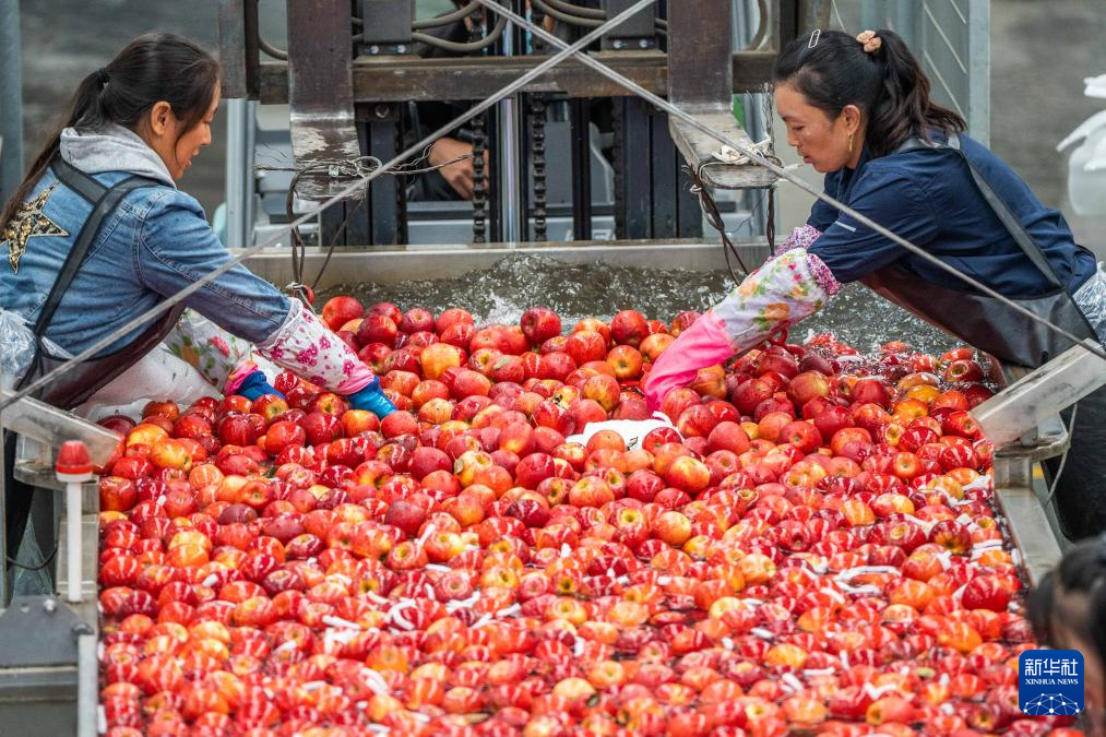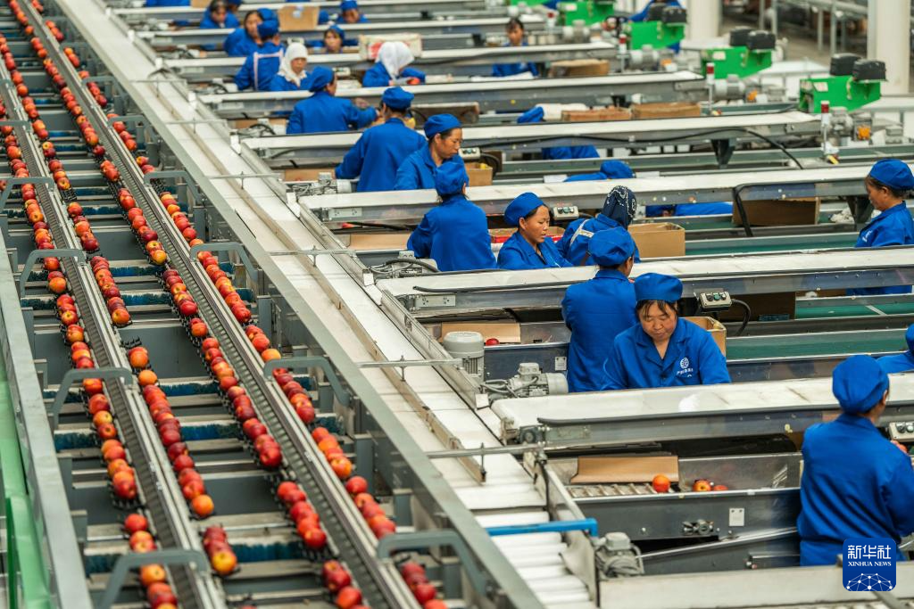 工人在毕节市威宁彝族回族苗族自治县五里岗工业区苹果分拣包装生产线上劳作(9月25日摄)。新华社发(罗大富 摄)