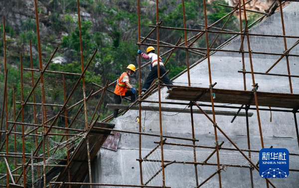6月14日,工人在贵州花江峡谷大桥引桥上施工。新华社记者 杨文斌 摄