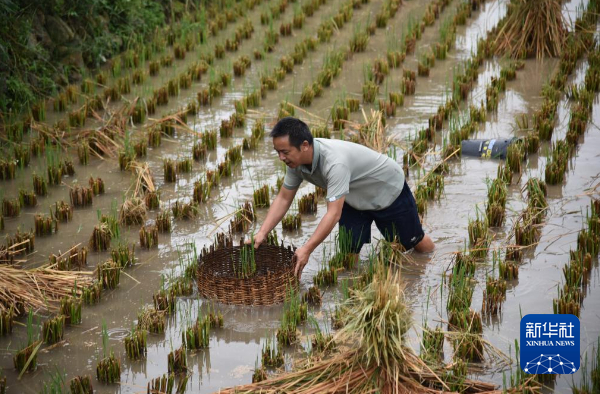 9月21日,台江县排羊乡排羊村村民在收割后的稻田里捕捞“稻花鱼”。新华社记者 骆飞 摄