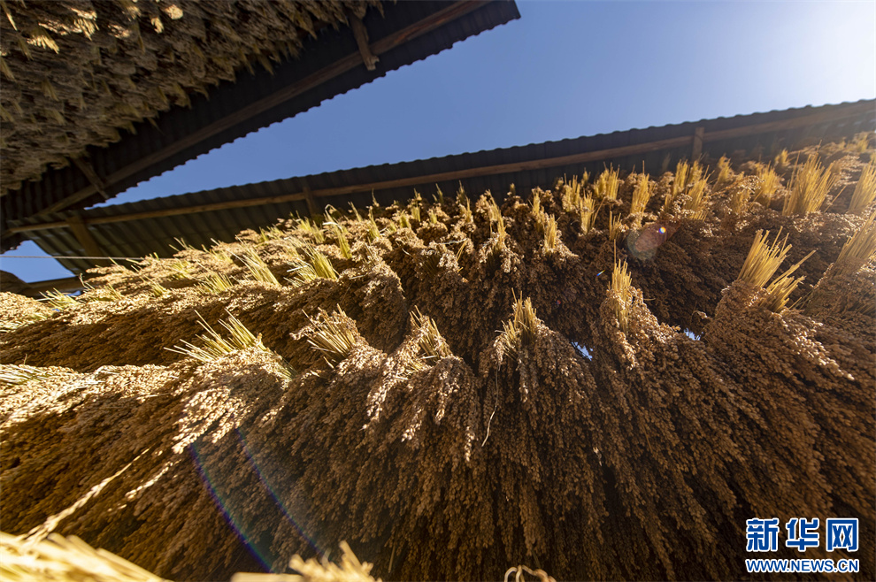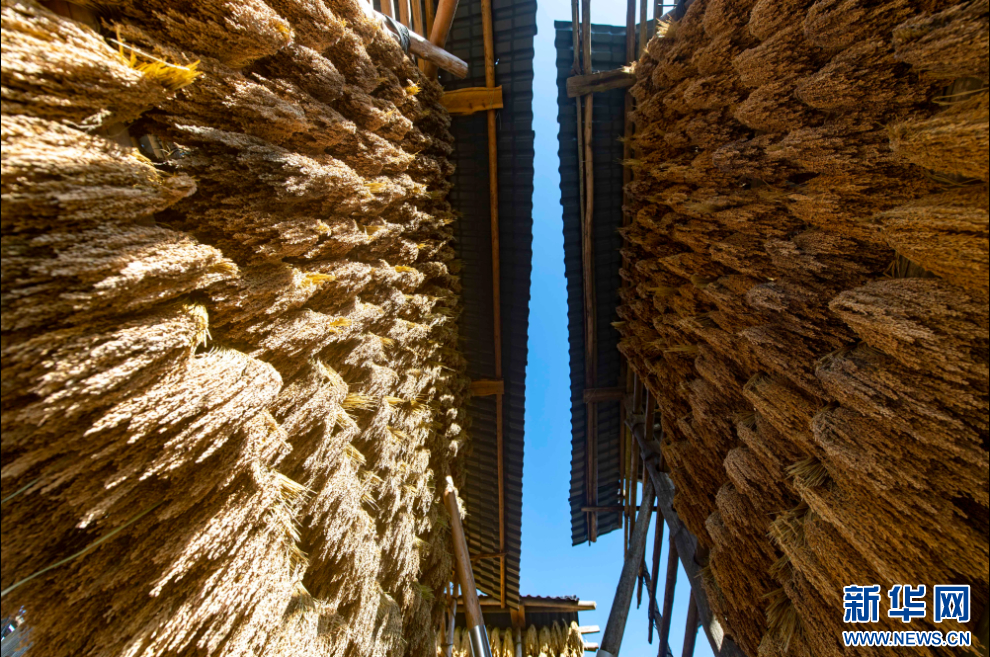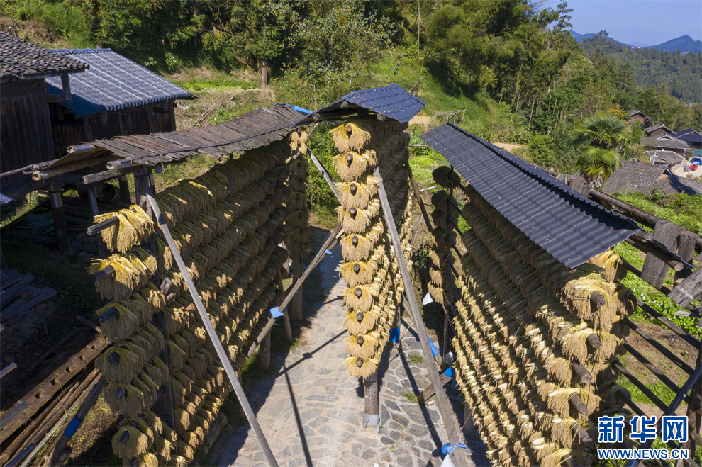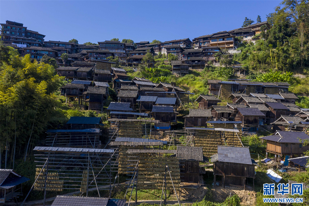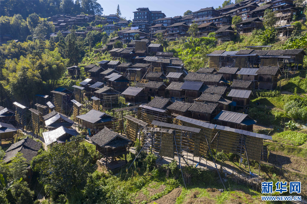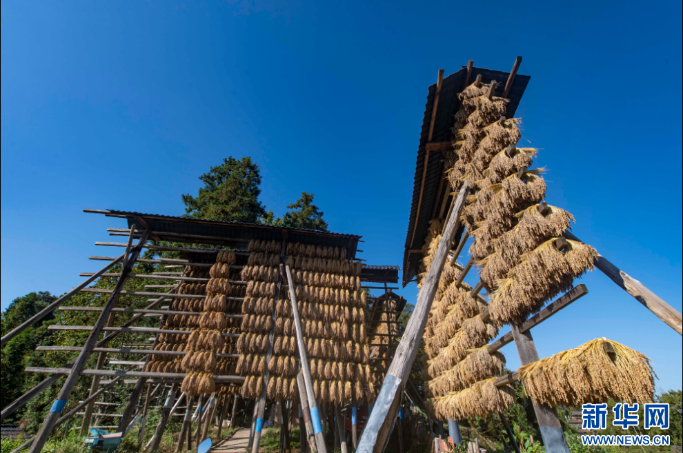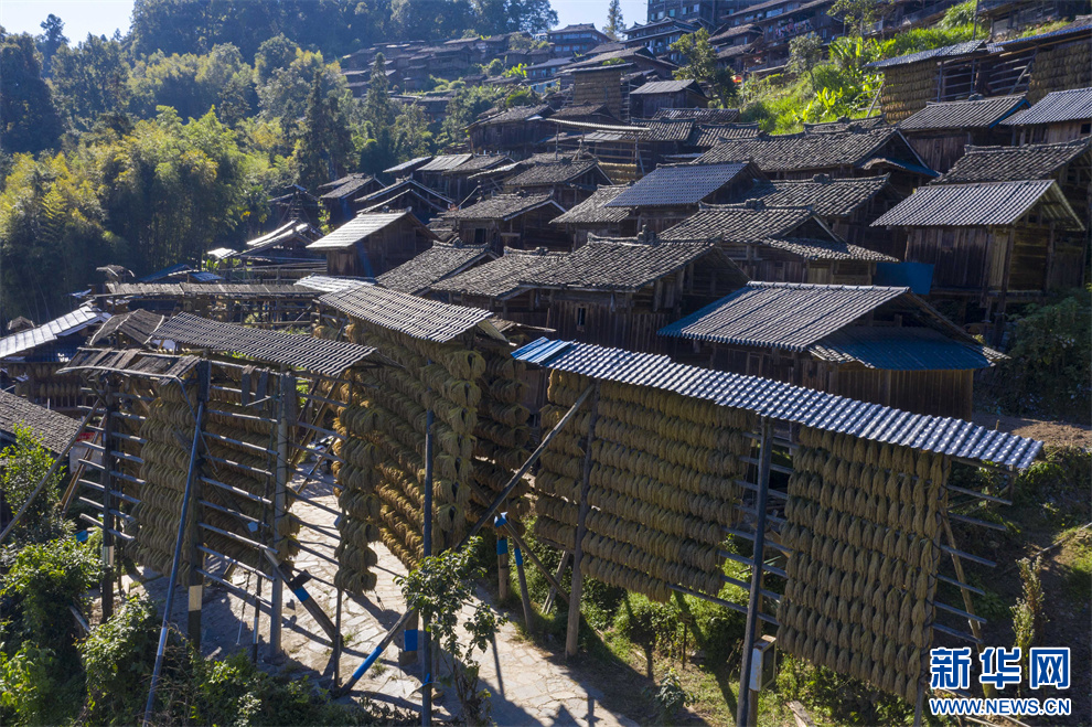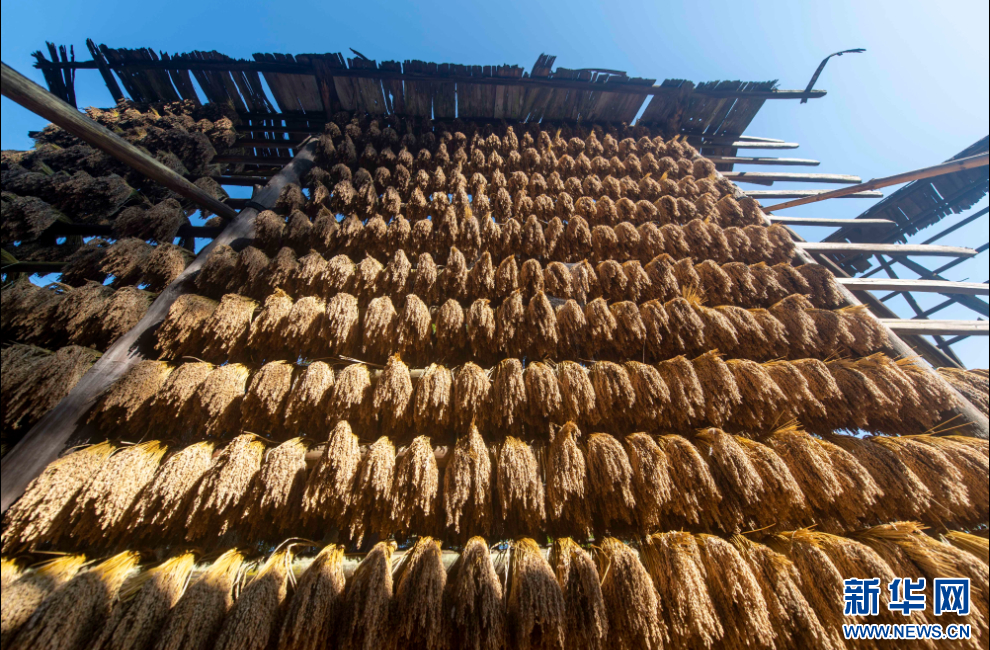 金秋时节,贵州省黔东南苗族侗族自治州从江县丙妹镇岜沙村苗族村民将丰收的糯稻谷晾晒在禾晾架上,成为一道美丽的景观。