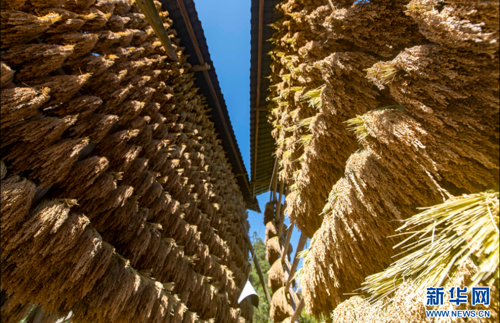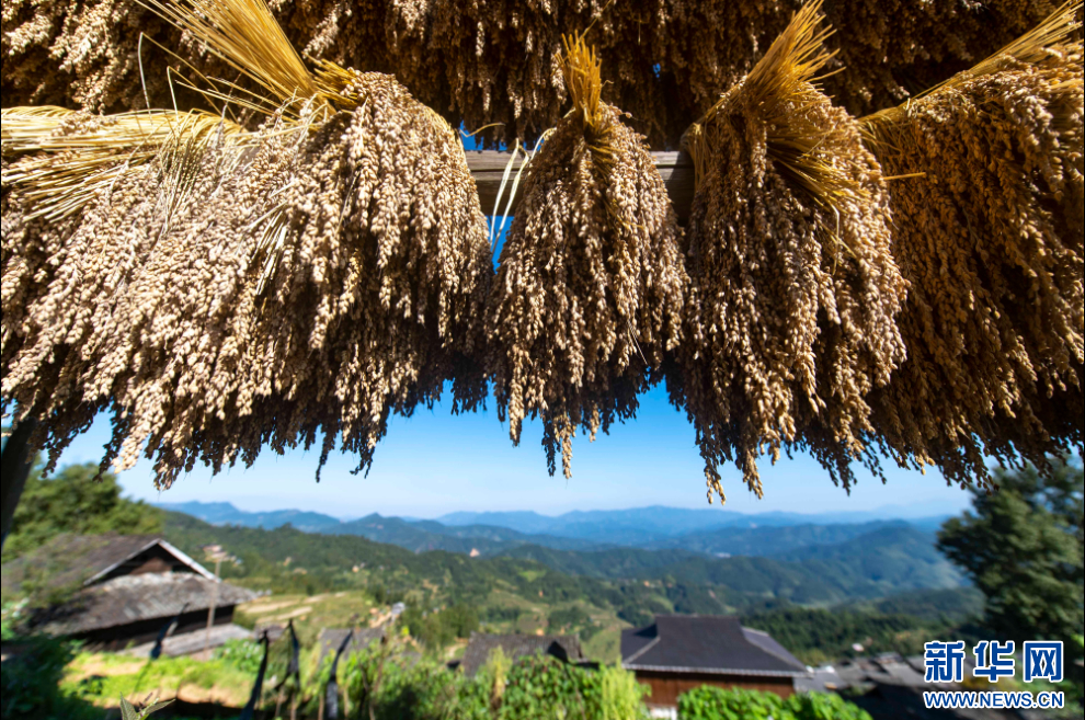 10月15日,在贵州省从江县丙妹镇岜沙村晾满糯稻谷的禾晾。新华网发(吴德军 摄)