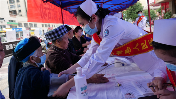 十月的清晨,海拔最高的茂井镇大亭村云雾缭绕,宛如人间仙仙境。镇卫生院院长张飞和同事早早来到集市上免费为当地群众开展义诊。“这里的群众赶集只赶早上,下午就散场了,大家都忙着回去干活,我们要更早地来,好为群众健康服务。”