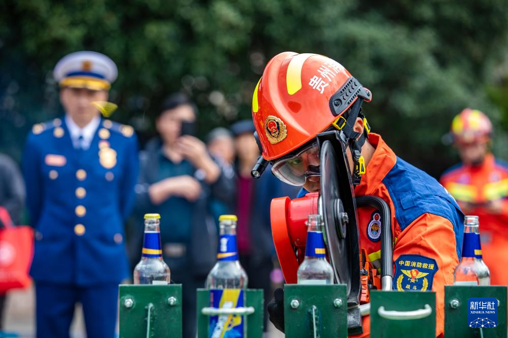 11月8日,在贵州省黔西市水西广场,消防员演示双轮异向切割机开瓶盖。新华社发(范晖 摄)