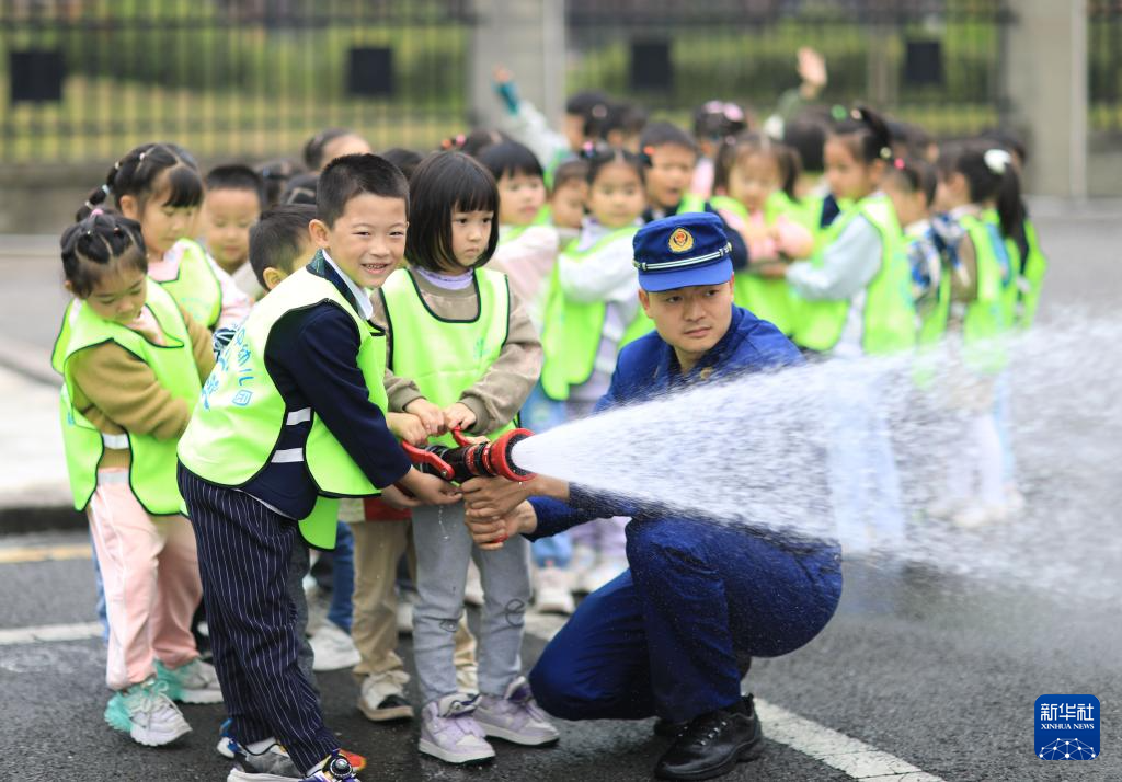 11月8日,在贵州省赤水市消防救援大队,小朋友在消防救援队员的辅导下体验使用消防水枪。