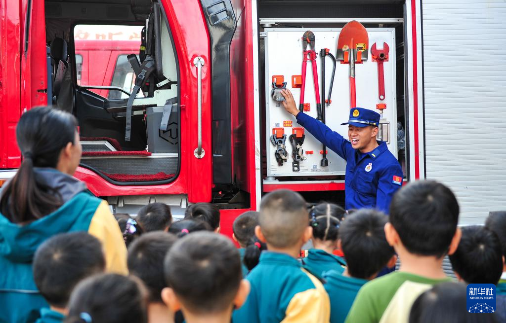 11月8日,在贵州省黔东南苗族侗族自治州从江县消防救援大队,消防救援人员给小朋友普及消防知识。新华社发(卢忠南 摄)pagebreak