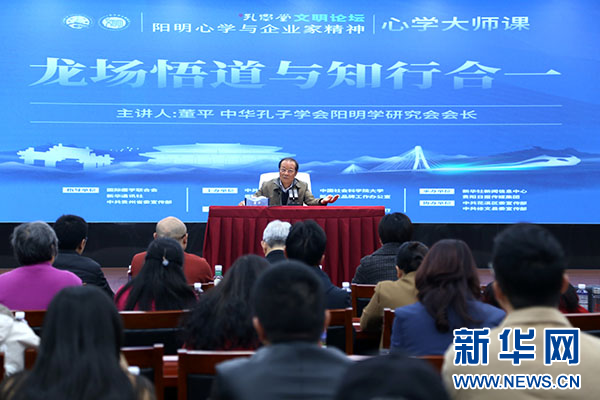 11月12日,中华孔子学会阳明学研究会会长董平主讲孔学堂文明论坛心学大师课“龙场悟道与知行合一”。新华网 周远钢 摄