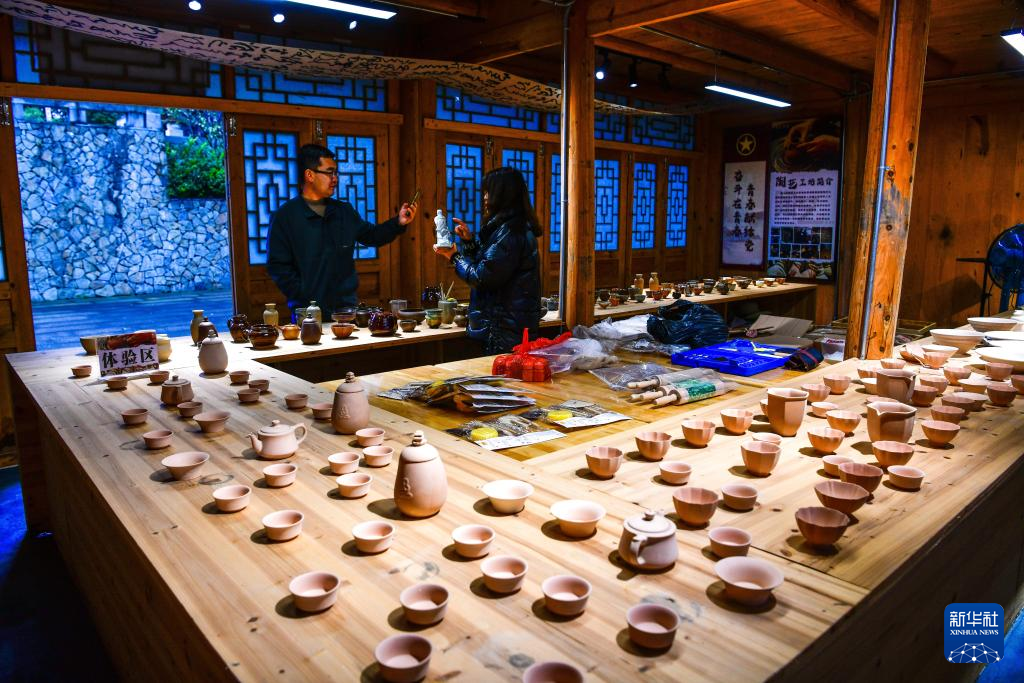 11月15日,帮扶干部在贵州省石阡县国荣乡楼上古寨的文创工坊里拍摄陶艺制品。新华社记者 杨文斌 摄pagebreak