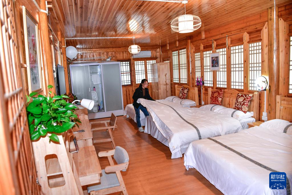 11月15日,贵州省石阡县国荣乡楼上村的村干部在整理民宿床铺。新华社记者 杨文斌 摄pagebreak