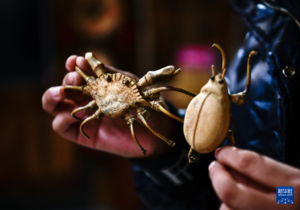 11月15日,帮扶干部在贵州省石阡县国荣乡楼上古寨的文创工坊里展示竹雕工艺品。新华社记者 杨文斌 摄pagebreak