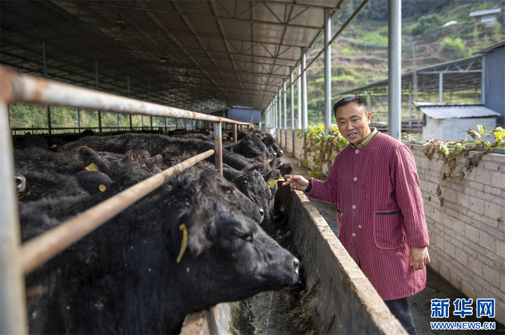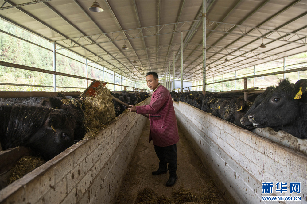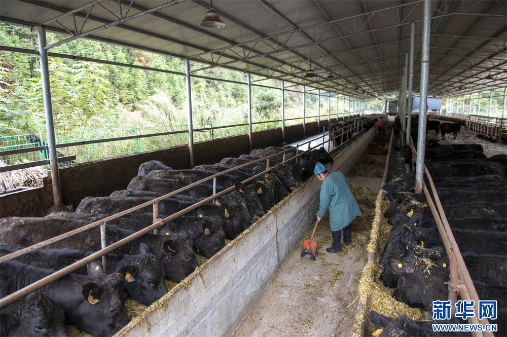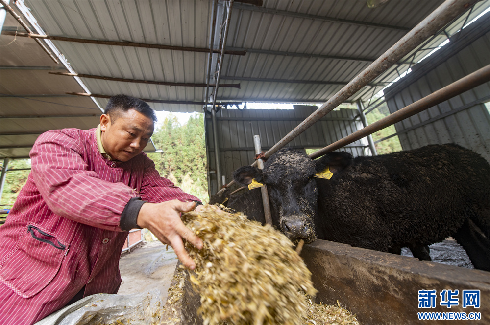 11月16日,养牛工人在贵州省从江县洛香镇伦洞村养牛场喂养牛。