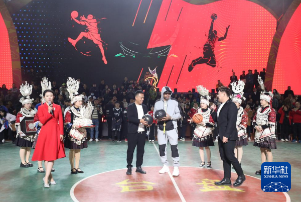 新华社贵阳11月16日电(记者罗羽)16日晚8点左右,在全场观众的注视之下,头戴一顶苗族银冠的前美国职业篮球联赛(NBA)球星阿伦·艾弗森,现身贵州省黔东南苗族侗族自治州台江县台盘村篮球场——一个因举办乡村篮球赛而火爆海内外的“篮球高地”。他与比赛球员和观众的互动,将现场的欢乐气氛一遍又一遍点燃。