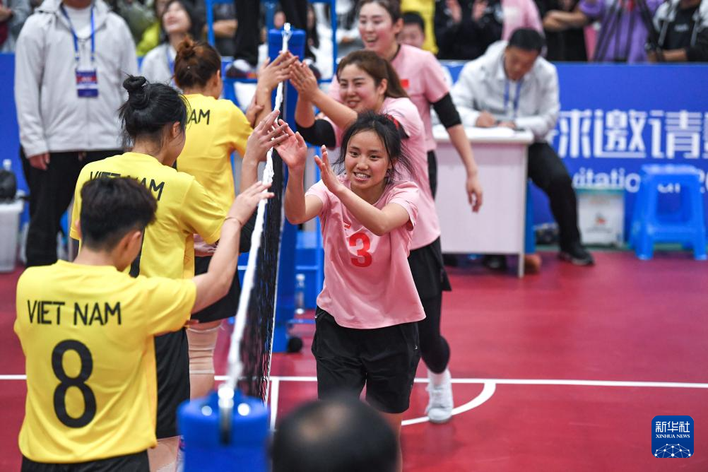 11月21日,中国队球员(右)与越南队球员在单组赛女子组决赛后击掌致意。新华社记者 杨文斌 摄pagebreak