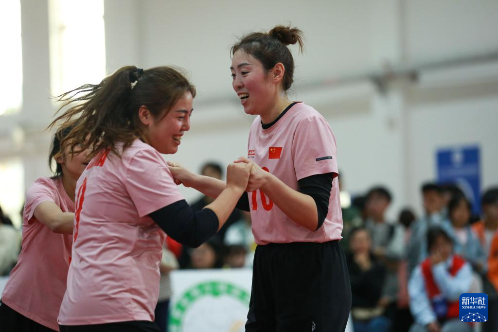 11月21日,中国队选手崔永辉(右)和队友在单组赛女子组决赛中庆祝得分。新华社发(肖伟摄)pagebreak