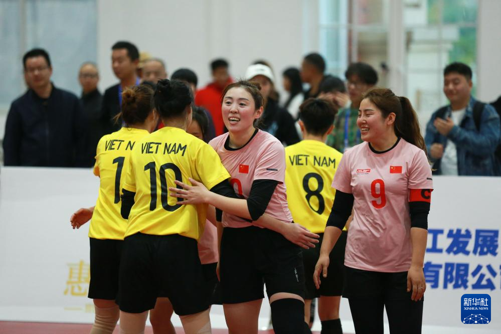 11月21日,中国队选手崔永辉(左三)与越南队球员武氏云英在单组赛女子组决赛后拥抱。新华社记者 杨文斌 摄pagebreak