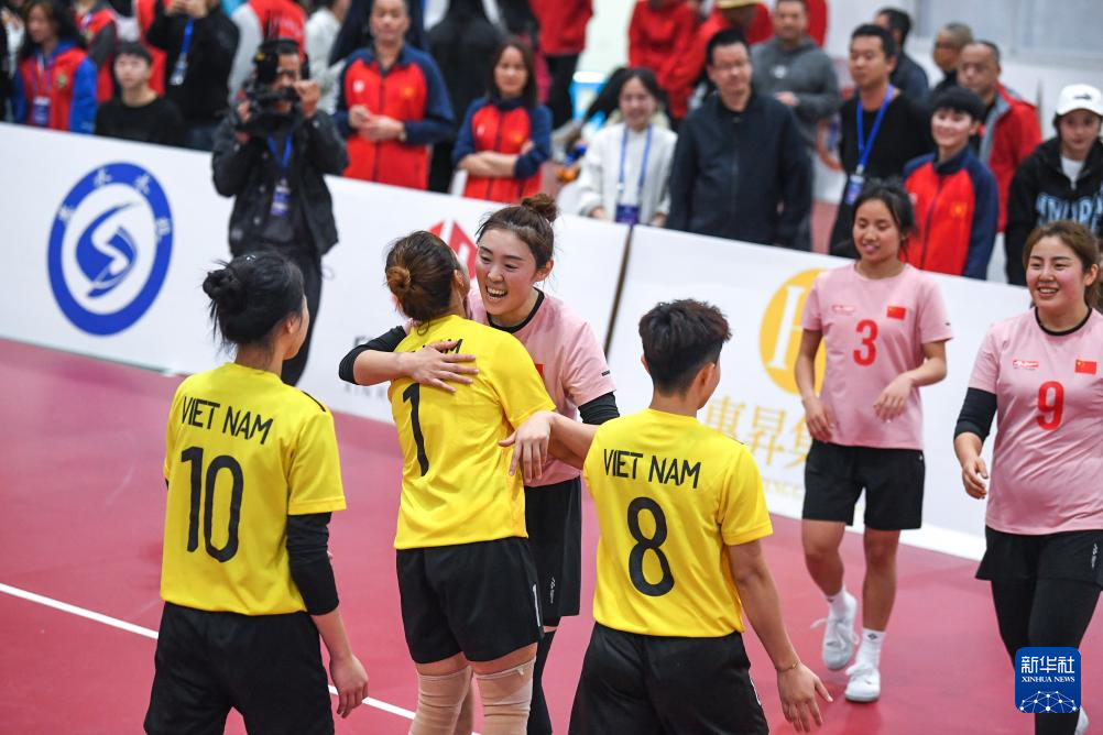 11月21日,中国队球员(右)与越南队球员在单组赛女子组决赛后拥抱致意。新华社发(肖伟摄)pagebreak