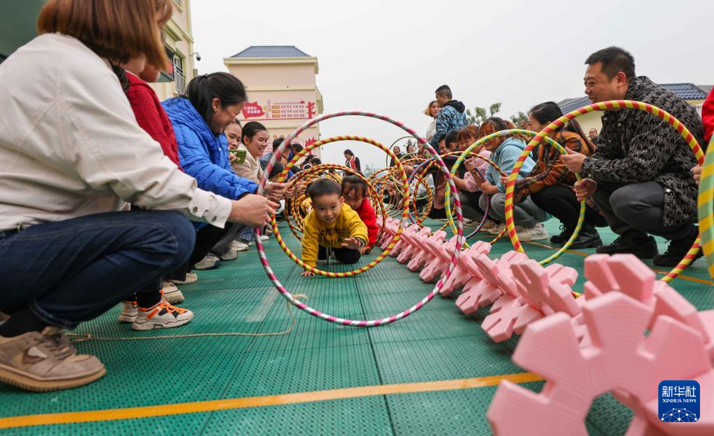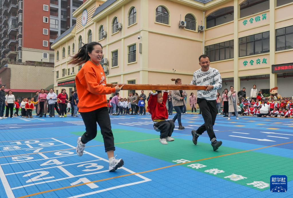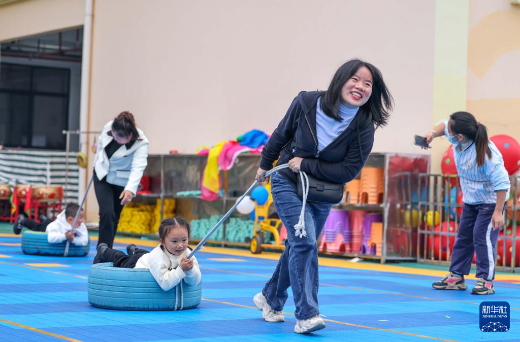 11月23日,在玉屏侗族自治县第三幼儿园,家长和孩子在进行运动游戏。新华社发(胡攀学 摄)