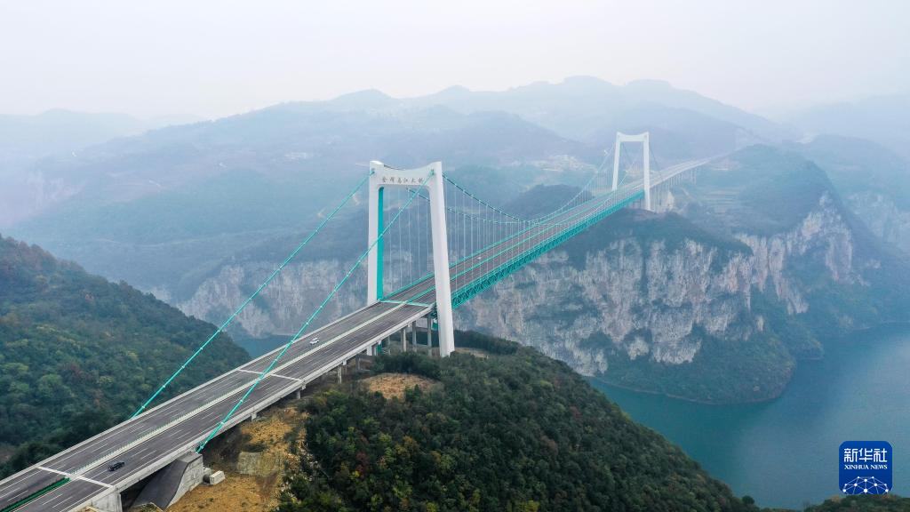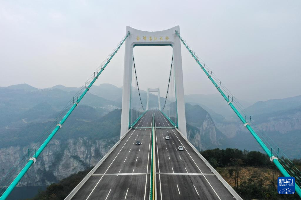 11月24日,车辆从贵金高速公路金烽乌江大桥上通过(无人机照片)。新华社记者 杨文斌 摄
