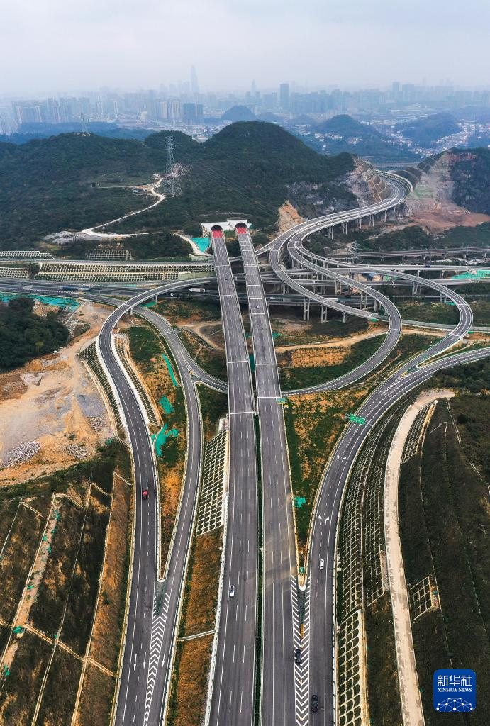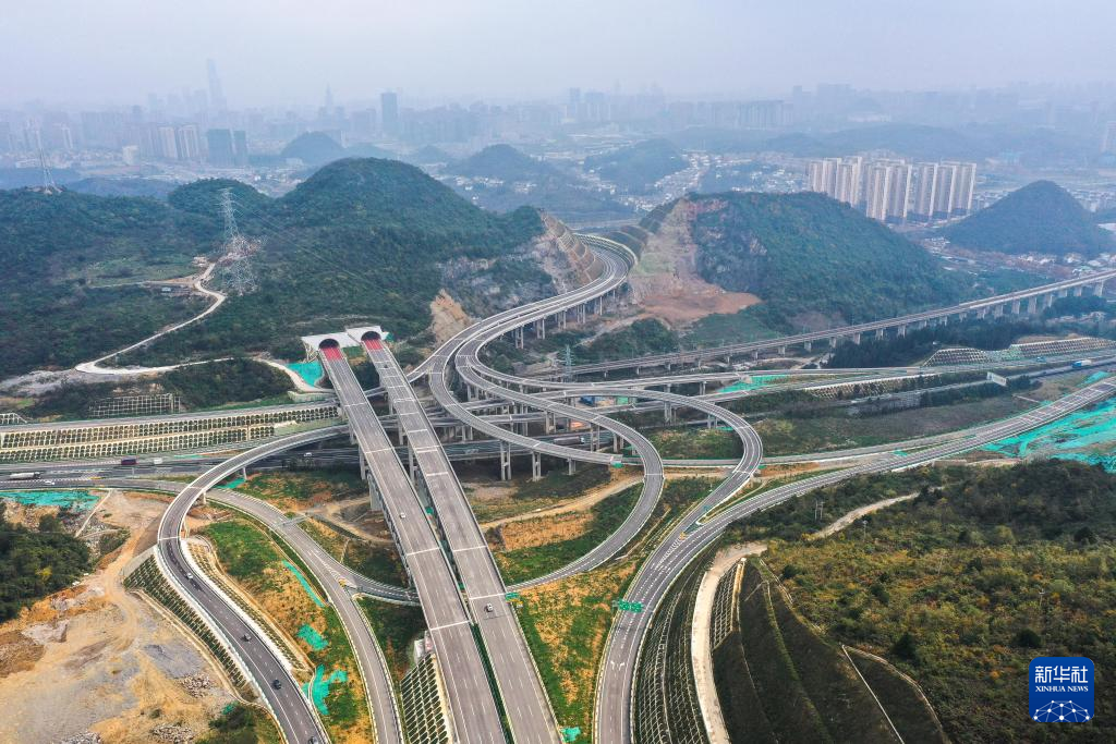 11月24日,车辆在贵金高速公路窦官枢纽互通上行驶(无人机照片)。新华社记者 杨文斌 摄