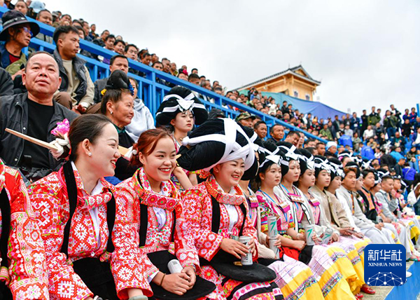 身着民族服装的观众观看全国和美乡村篮球大赛总决赛第三轮小组赛(2023年10月27日摄)。新华社记者 杨文斌 摄