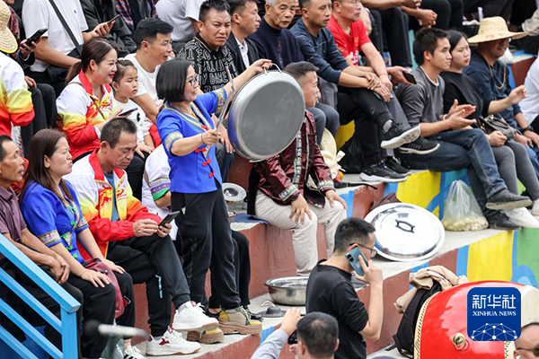 观众在看台上敲铁锅助威(2023年10月25日摄)。新华社记者 欧东衢 摄