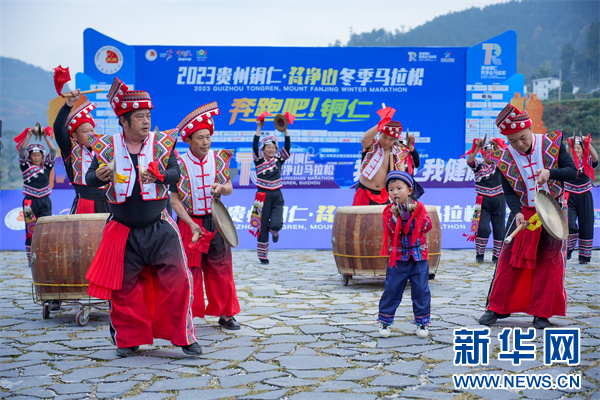 11月26日,在2023贵州铜仁·梵净山冬季马拉松活动现场展开的民俗表演。
