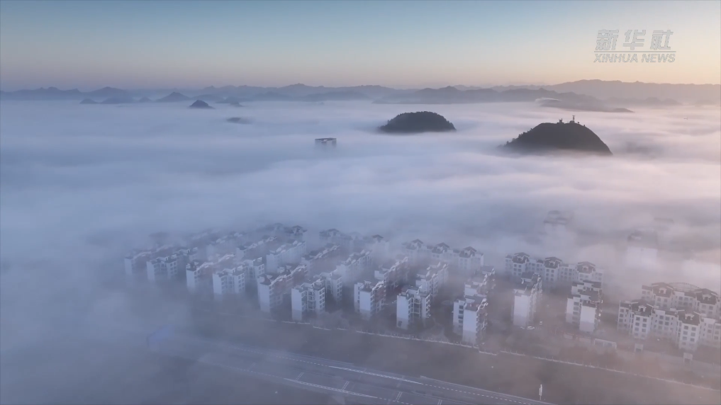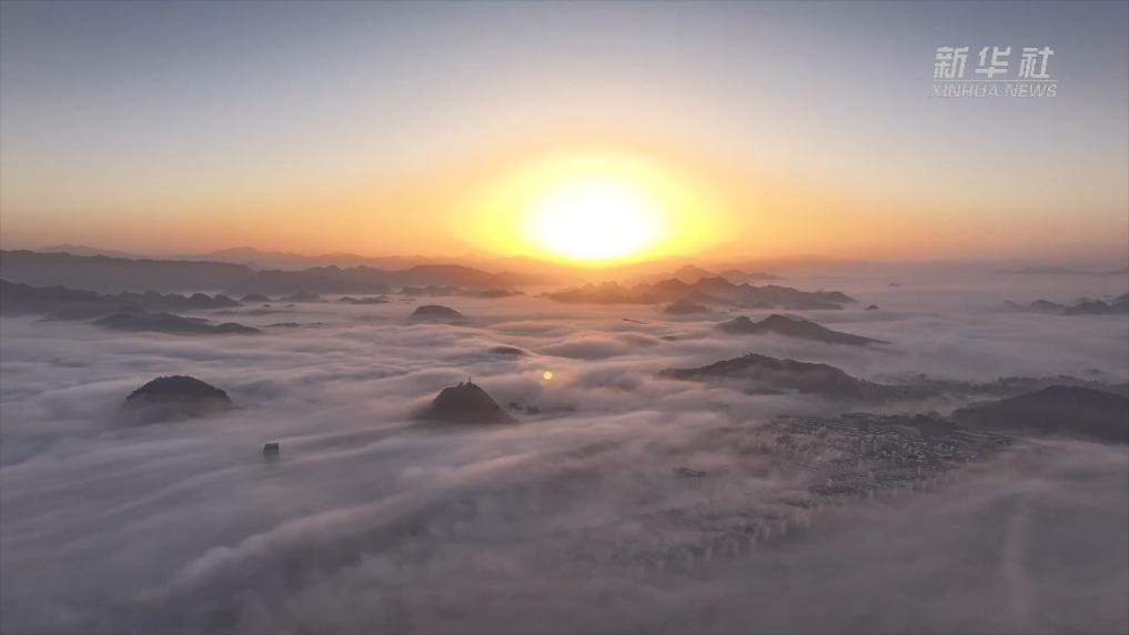 近日,贵州省丹寨县出现云海景观。苍茫的云海在山间聚散开合,配合着万道朝霞,从高空俯瞰,县城在云海中若隐若现,宛如仙境美不胜收。
