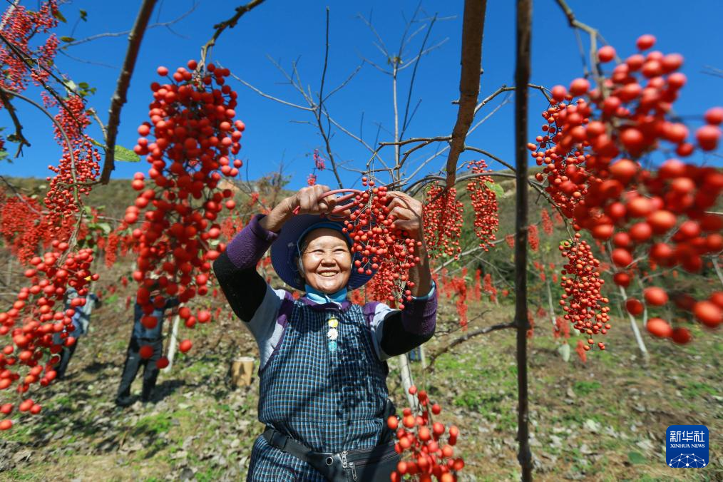 11月28日,村民在贵州省贵定县宝山街道山桐子种植基地采收山桐子。新华社发(肖伟 摄)pagebreak