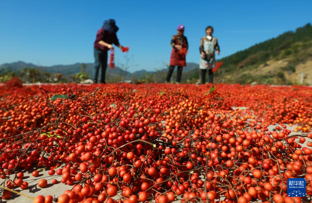 11月28日,村民在贵州省贵定县宝山街道山桐子加工基地晾晒山桐子。