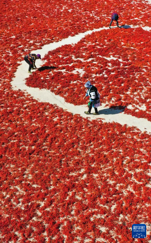 11月28日,村民在贵州省贵定县宝山街道山桐子加工基地晾晒山桐子(无人机照片)。新华社发(肖伟 摄)pagebreak